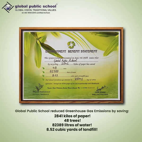 Global Public School has been recognised for its contribution through the WOW (Wealth out of Waste) project by Itc Ltd in association with Plan@Earth and has been awarded a Green certificate.